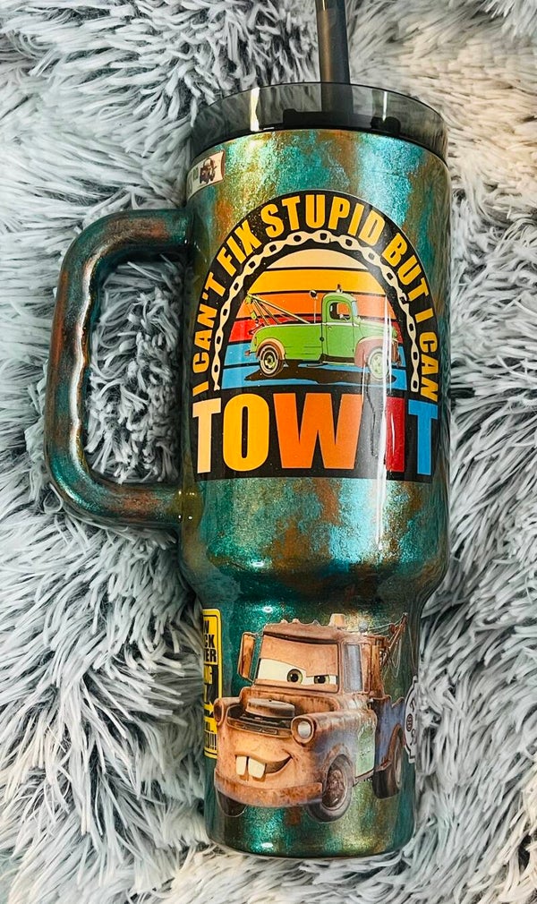 40oz Stainless Tumbler, artist will communicate to create a design for your idea and provide a mockup for approval prior to making your tumbler. Photo is example of a recent custom order.
